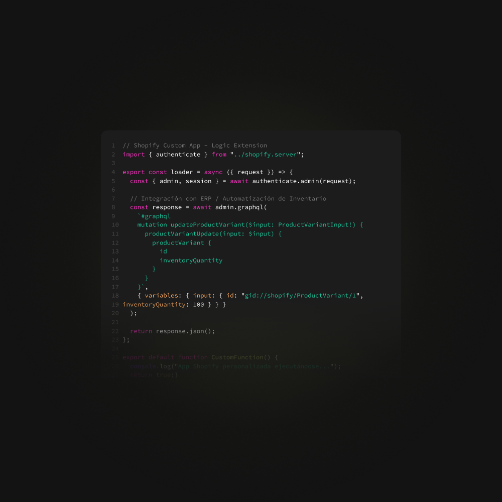 Desarrollamos apps Shopify privadas y públicas a medida. Integraciones con ERPs, automatizaciones, funcionalidades personalizadas y extensiones de checkout. Si lo puedes imaginar, lo podemos construir.